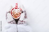 Female hands holding hot chocolate with marshmallow and cinnamon. Warming holiday drink on a white background. Warm Christmas.CocoaTop view with Copy space