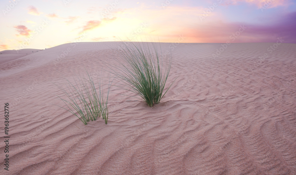 Sunset paints pink desert dunes with green grasses. Sand ripples flow gently under warm light. Solitary plants stand tall against soft horizon. Scene evokes peace
