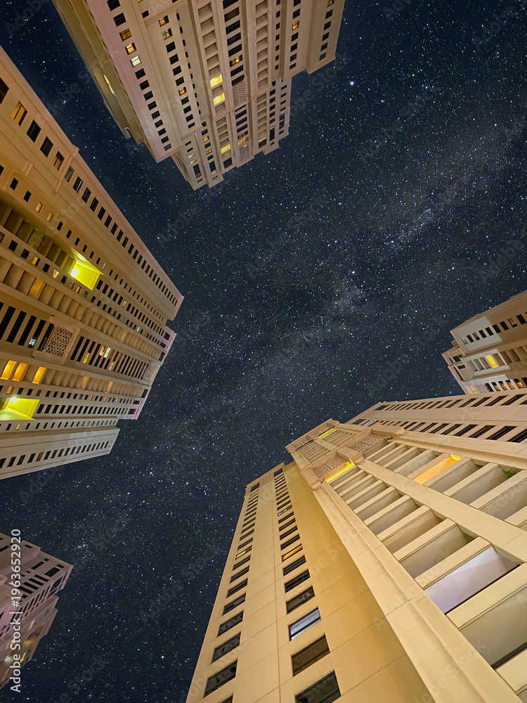 City skyscrapers frame a starry night sky. Warm lights glow from windows against dark buildings. Milky Way stretches across the urban landscape