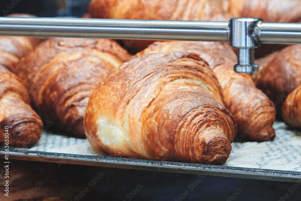 Freshly baked croissant with golden crust sits on tray. Warm, flaky pastry glistens under soft light. Perfect for breakfast or cafe settings. Ideal for food blogs