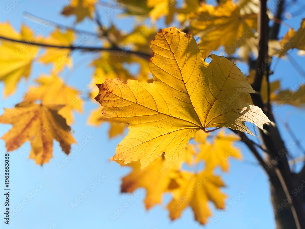 Golden maple leaf shines under bright blue sky. Warm sunlight highlights leaf's crisp edges and veins. Autumn colors glow vividly against clear background