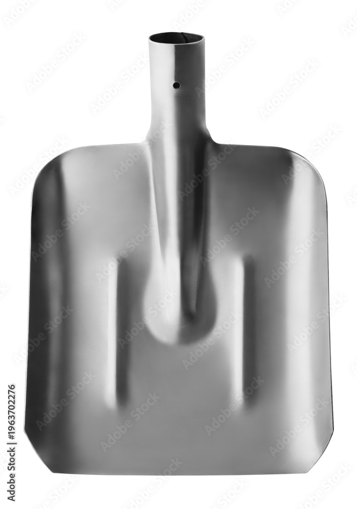 Shiny steel shovel with smooth, reflective surface. Sleek design for digging or moving materials. Ideal for construction, landscaping, or gardening projects