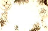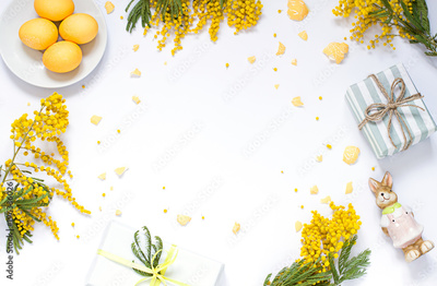 Easter concept frame with eggs, a bunny, mimosa flowers and gifts. Top view composition. Copy space