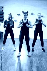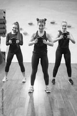 Three young women in sports wear working out with weights in gym.