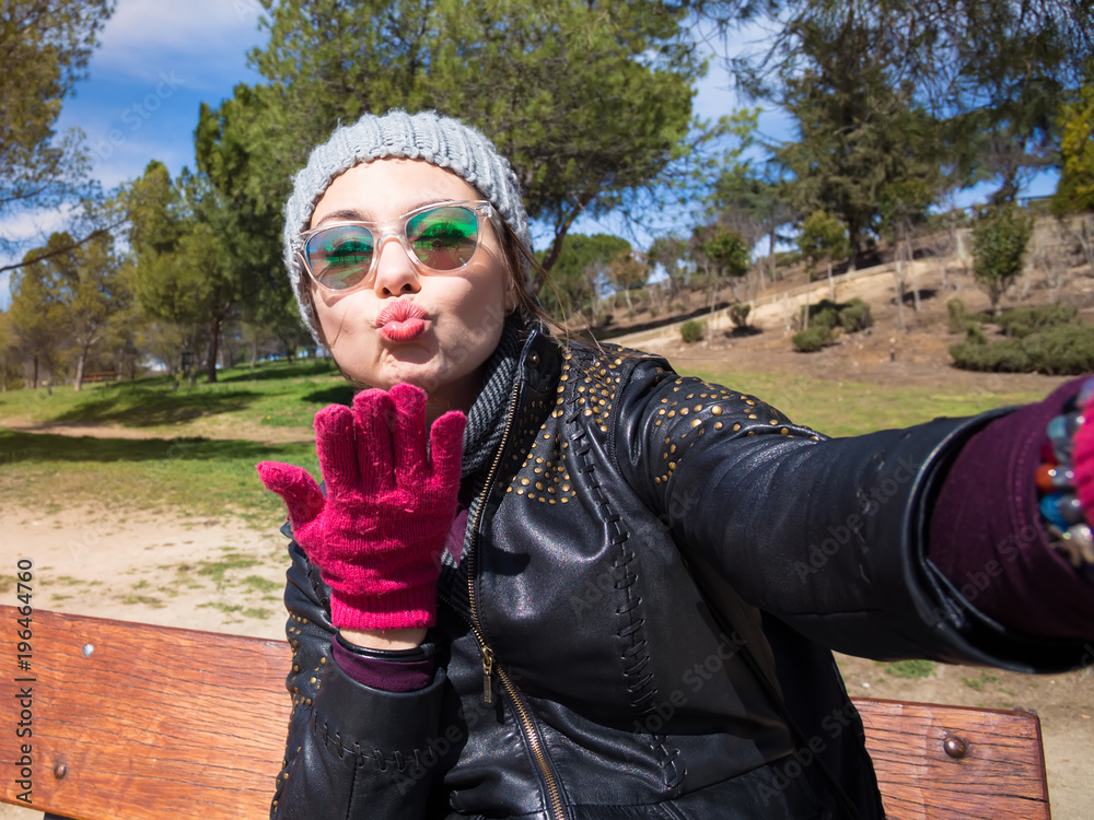 Portrait of a smiling young girl making selfie photo in park.Outdoor portrait of pretty student girl taking a selfie and smiling.