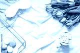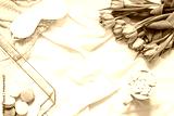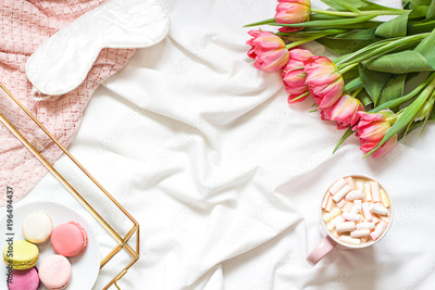 Breakfast in bed pastel flat lay frame composition with flowers, a cup o coffee and sweets. Concept spring top view