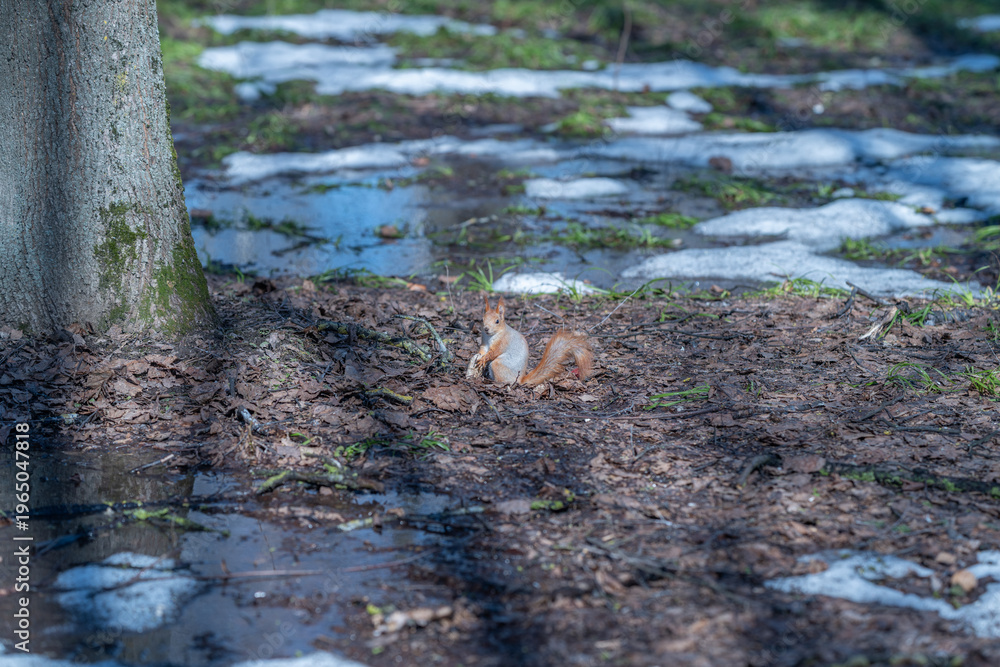 Energetic squirrel hops across rainy park floor during seasonal change. Lively squirrel quickly hops over wet patches with scattered leaves in bright morning sunlight
