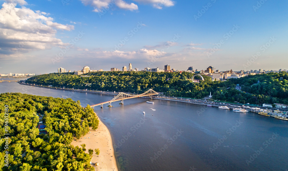 Aerial view of the Dnieper with the Pedestrian Bridge in Kiev, Ukraine