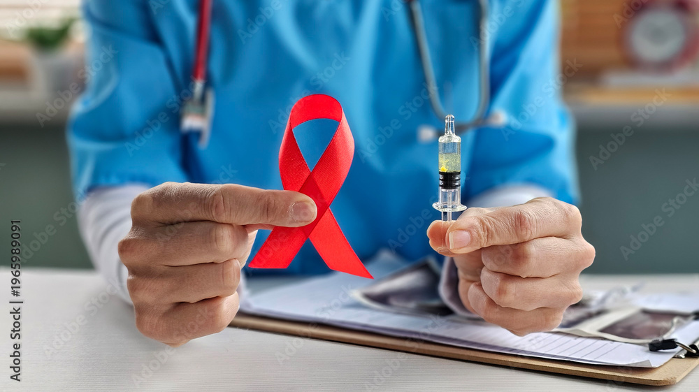 Healthcare worker holds red ribbon for AIDS awareness and syringe for vaccination