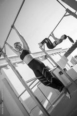 Two sporty girls workout together on horizontal bars during calisthenics training outdoors.