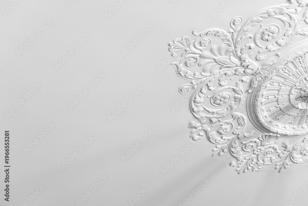 Ornate white plaster ceiling medallion with intricate floral molding and classical details set against a minimal white surface evoking vintage elegance, interior design and architectural craftsmanship