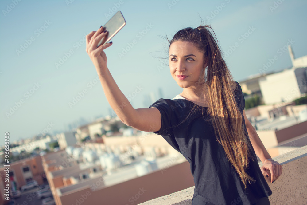 Portrait of beautiful long haired girl taking a selfie outdoors.
