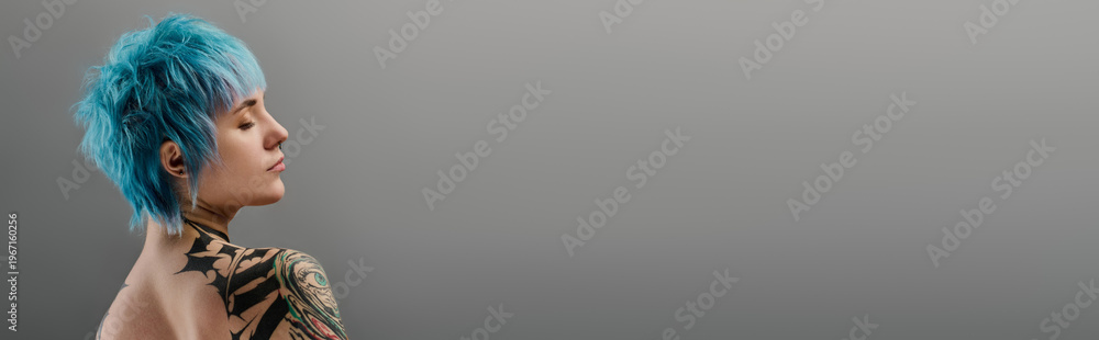 Stylish young woman with vibrant blue hair showcases unique tattoos in a modern studio