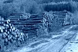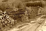 Stacked chopped tree wood trunks bundle for fuel in wilderness forest woods