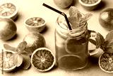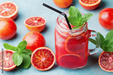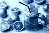 Jar glass with fruit lemonade decorated mint leaves on turquoise table. Homemade summer vitamin juice.