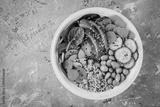 Vegan Buddha bowl salad with spinach, quinoa, roasted chickpeas, grilled chicken, avocado, edamame beans, cucumbers, sesame and pumpkin seeds.
