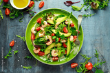 Fresh Avocado, shrimps salad with lettuce green mix, cherry tomatoes, herbs and olive oil, lemon dressing. healthy food