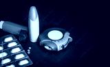 Set of asthma inhaler, accuhaler and anti-allergy pills for treatment asthma. Asthma controller, reliever equipment on blue table with copy space. Bronchodilator and steroids drug for severe asthma.