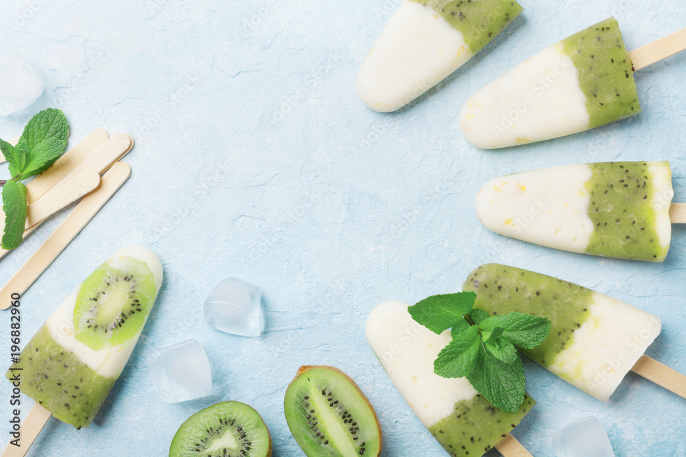 Fruity homemade ice cream or popsicles from kiwi smoothie and yogurt top view. Summer refreshing food.