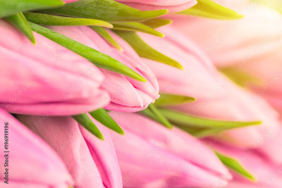 Nice natural bouquet from pink tulips as a romantic background. Selective focus. Pink tulips close up. Pink tulips spring flowers. Mothersday background. Selective focus.