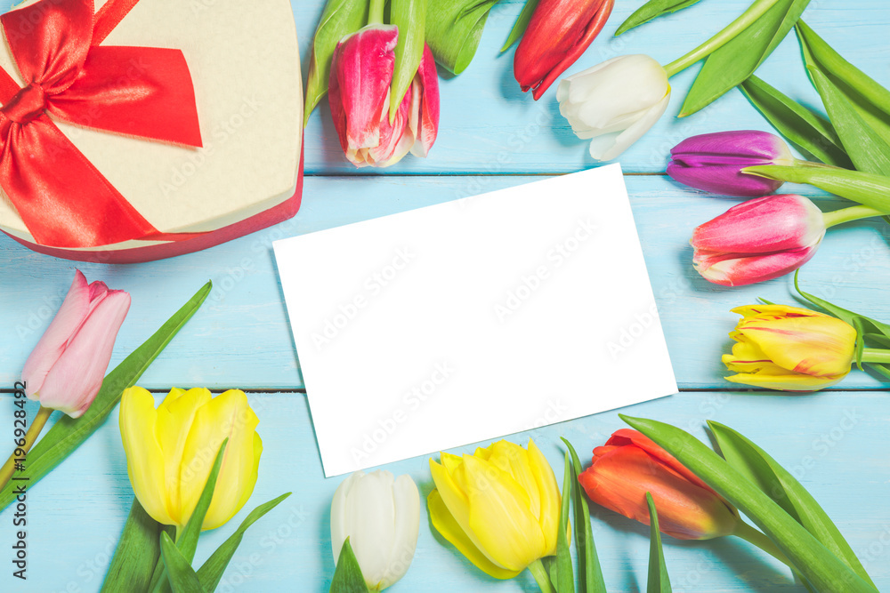 Colorful spring tulip flowers with decorative giftbox and blank photo on light blue wooden background as greeting card. Mothersday or spring concept.