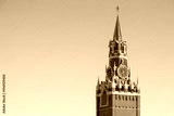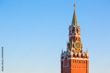 Spasskaya tower Of Kremlin on red Square in Moscow, Russia against blue sky. World famous moscow Landmark.
