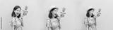 Young girl happy smile and cheerful in blue dress, hold two pineapple in hand. Concept summer travel.