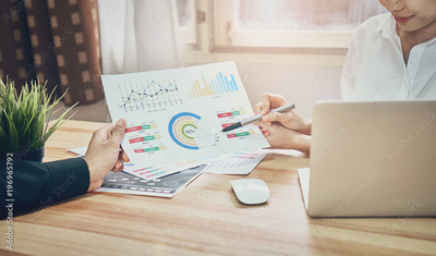 teamwork, Young businesswoman in office in casual shirt. Selecting information with colleagues with a computer. Business Marketing Planning.
