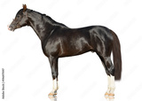 The brown powerfull Arabian horse standing isolated on white background. side view