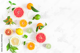 Fruit background. Colorful fresh fruits on white table. Orange, tangerine, lime, lemon, grapefruit. Flat lay, top view, copy space
