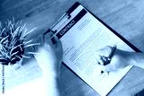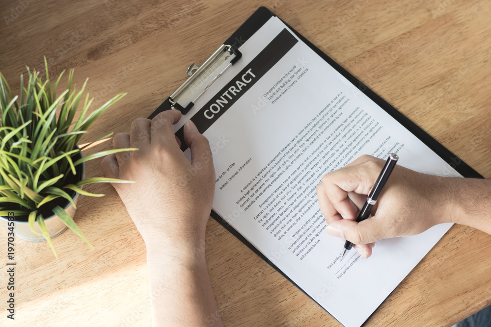 Businessman signing on contract paper on table after accepted deal and agreement .