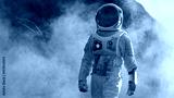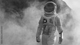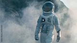 Shot of Astronaut Walking on Alien Rocky Planet that is Covered with Gas and Smoke. Humans Overcoming Difficulties. Scientific Progress.