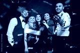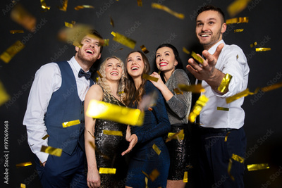 happy friends at party under confetti over black