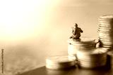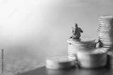 Business, Money and planning concept. Businessman miniature figure sitting and reading a newspaper on top of stack of silver coins.