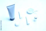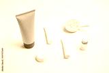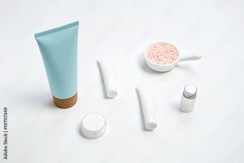 Mockup of cosmetic cream bottle, Blank label package and ingredients on a white background. Concept of natural beauty products.