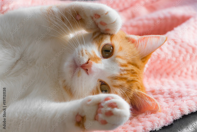 両手を挙げて超可愛らしい茶白ネコ