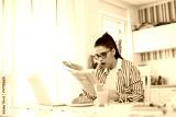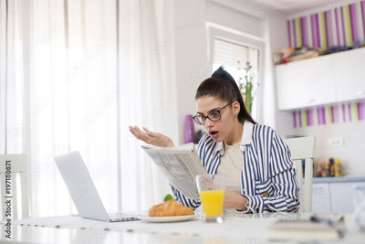 Young girl reads a morning newspaper