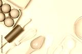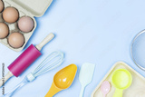 Baking utensils tool pastel style on blue background topview flatlay copyspace.