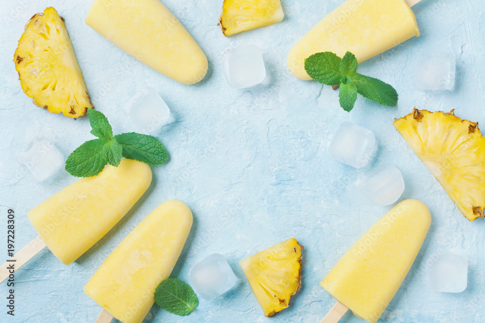 Yellow frozen fruit popsicles or homemade ice cream of pineapple top view. Summer food.