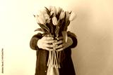 man holds bouquet of yellow tulips in front of him. romantic gift for woman. white background