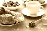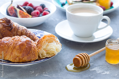 Breakfast concept close up with honey, croissants and a cup of coffee.