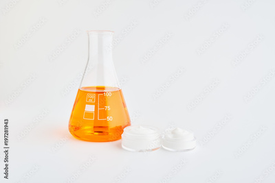 Ingredients of skin care products. the glass, Blank label package for mockup on white background. The concept of natural beauty products.