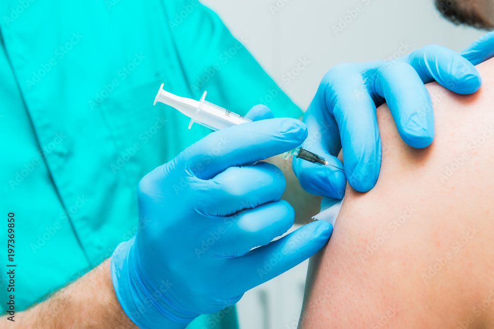Close up Neurologist doctor makes an injection therapy (blockade) into deltoid muscle of male patient. Alternative pain treatment concept. Selective focus, space for text.