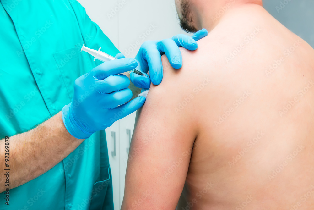 Close up Neurologist doctor makes an injection therapy (blockade) into deltoid muscle of male patient. Alternative pain treatment concept. Selective focus, space for text.
