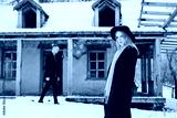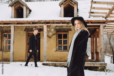 Young couple think of a beautiful future next to an old house in winter near a beautiful pond