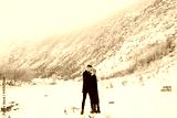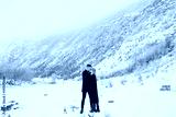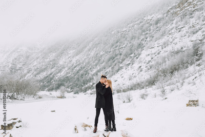 Beautiful couple stood on a beautiful hillside with winter scenery