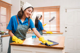 Two uniformed cleaners tidy a bright kitchen, wearing yellow gloves and aprons while dusting and polishing a wooden countertop.
