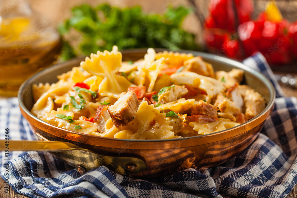 Pasta farfalle with chicken and paprika, in carbonara sauce.