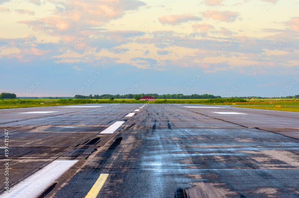 Sunrise with landscape airport of wet runway with traces of rubber tires on asphalt.