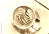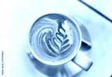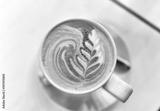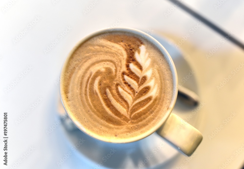 Cup of coffee latte with leaf design art in froth and viewed from top